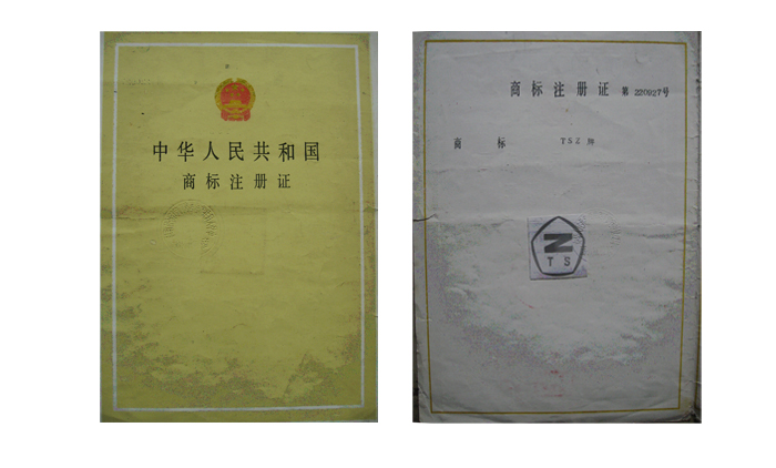 商標注冊:1985年2月27日由《中華人民共和國國家工商行政管理局商標局》批準為注冊商標,核定使用商標第10類(國際分類第7類)注冊號220927 “TSZ” 牌商標注冊證。