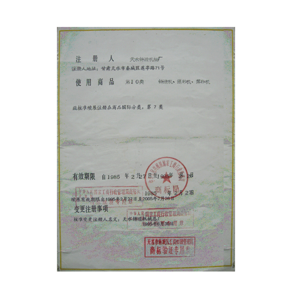 “TSZ牌”商標續(xù)展證明:1995年2 月27日第一次續(xù)展,持證人由天水鑄造機械廠變更為天水鑄造機械總廠